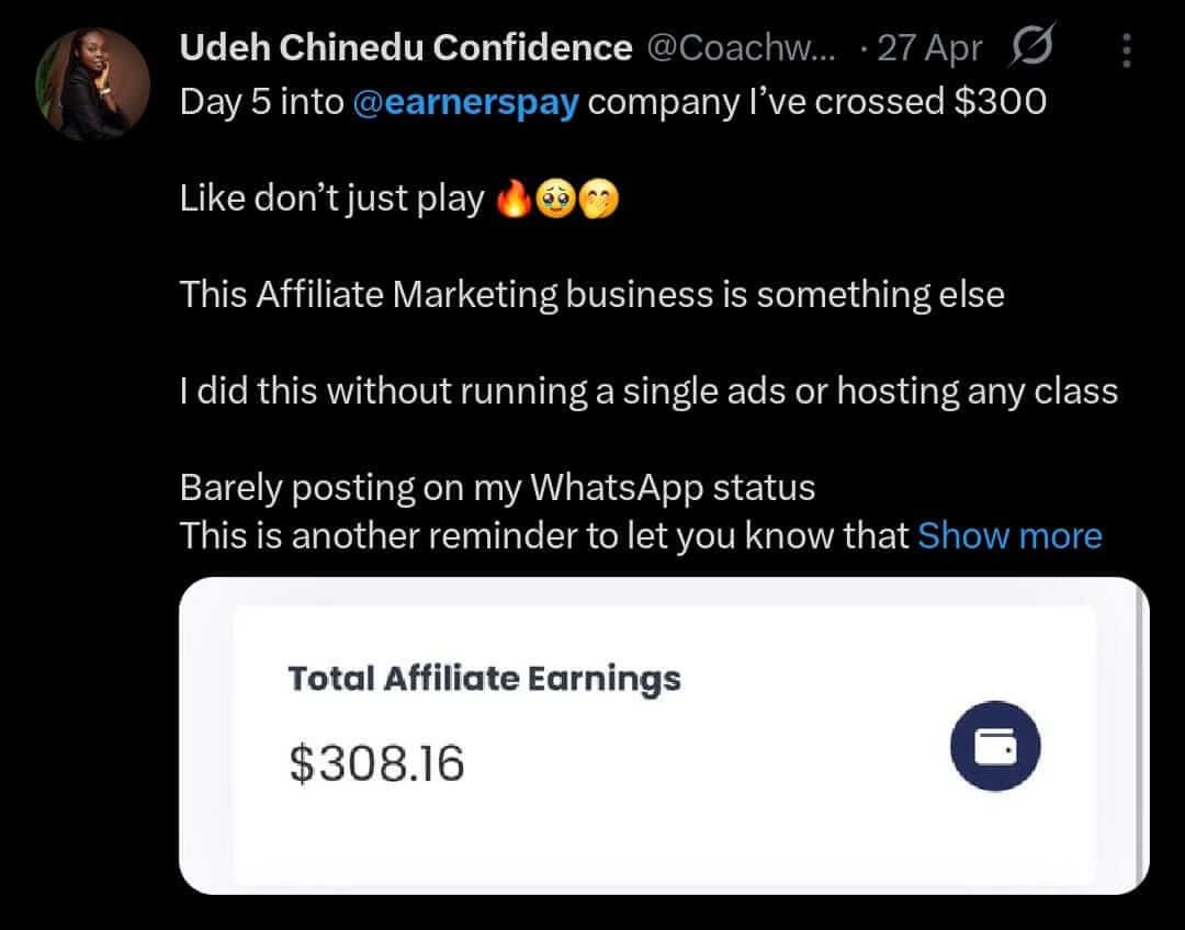 • You're getting the Affiliate Marketing for Beginners Program – the full step-by-step training that takes you by hand and shows you how to go from zero to N750,000 a month or more using WhatsApp and EarnersPay. (Value - N100,000)