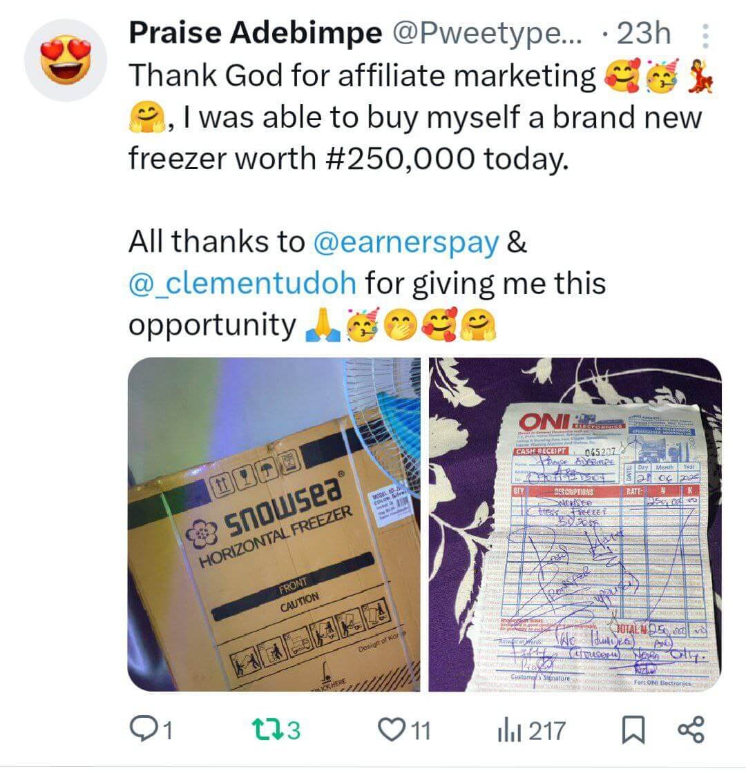 • BONUS #1: 1 Year FREE EarnersPay Account - You'll need an EarnersPay affiliate account, which usually costs N7,000 a year. But you'll get one year for free!